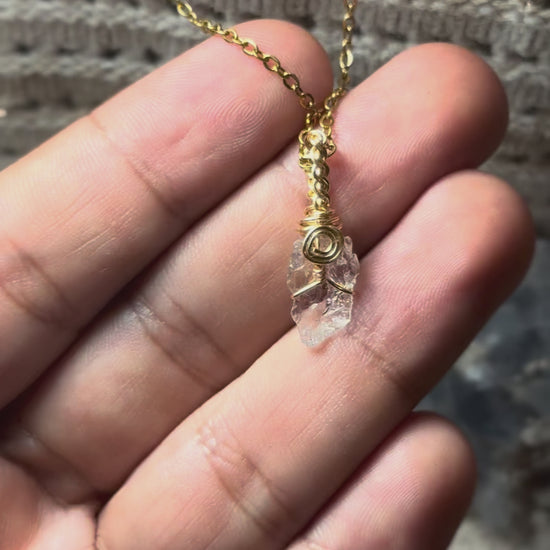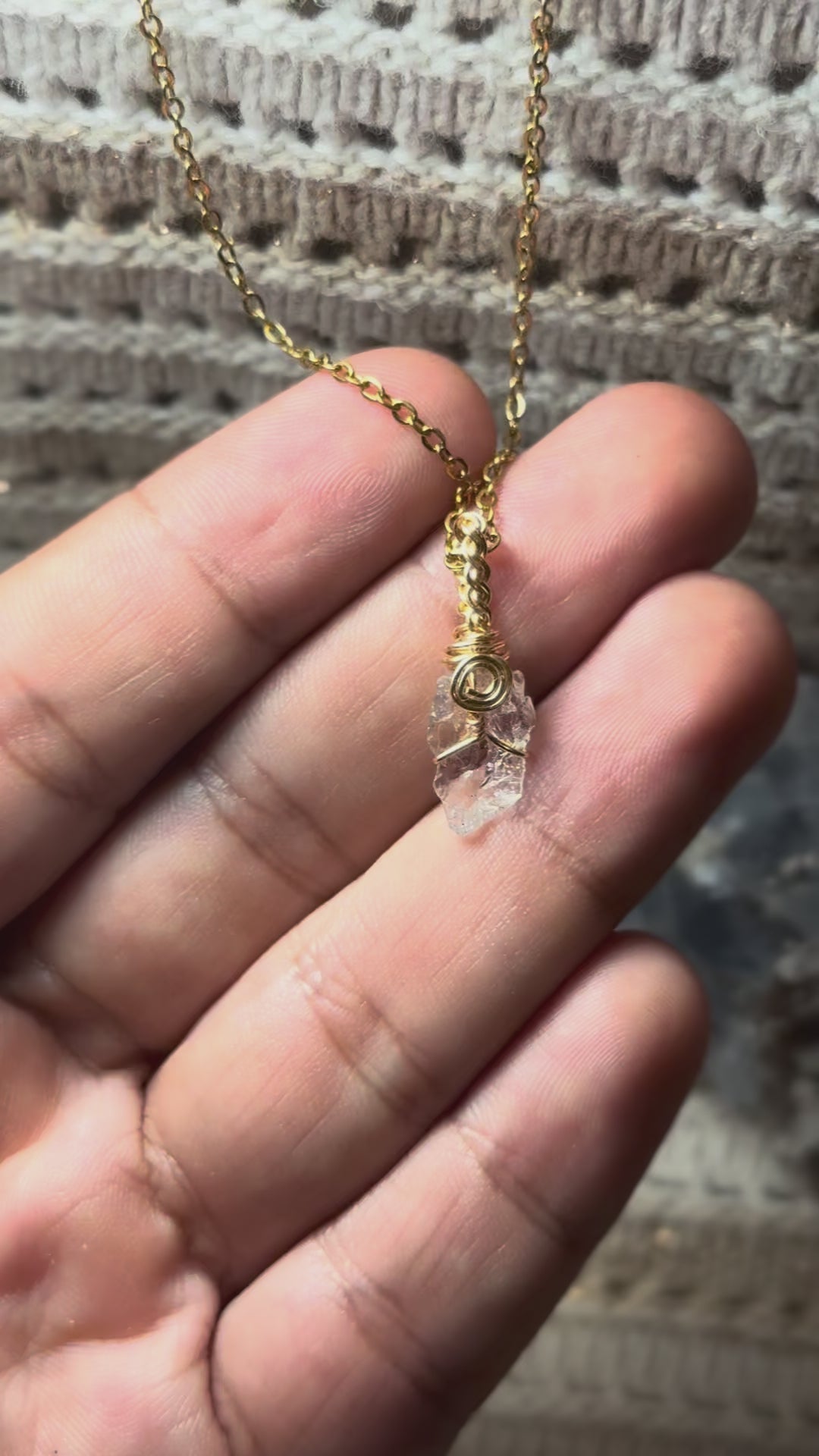 Abraza la belleza en bruto y la claridad con este fragmento hecho a mano de Diamante Herkimer, envuelto en alambre de oro grado AAA sobre una cadena de acero inoxidable construida para durar.