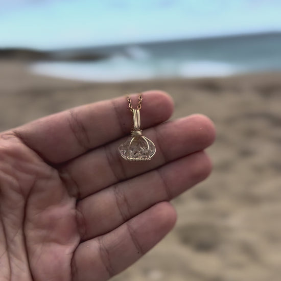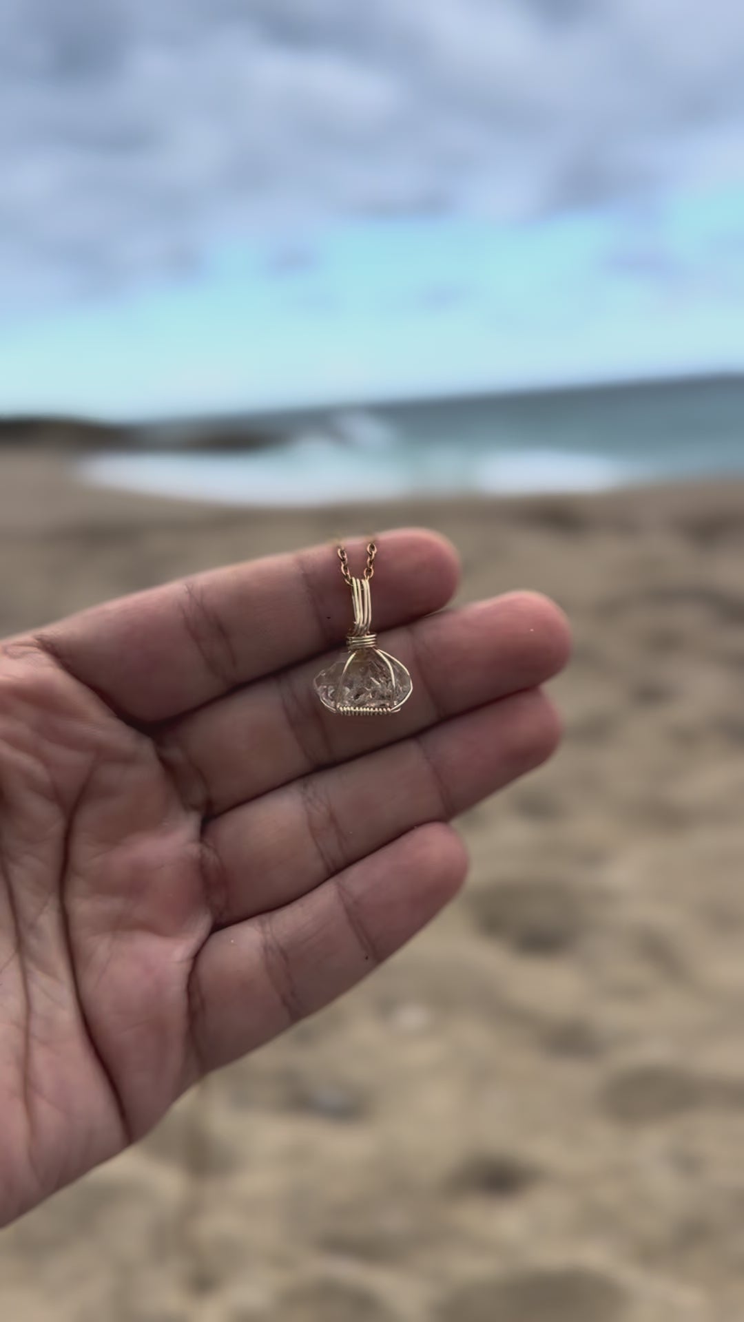 Descripción del Producto: Un cuarzo Diamante Herkimer en bruto, celebrado por su claridad radiante y altas vibraciones, envuelto a mano con alambre de oro grado AAA. Suspendido de una cadena de acero inoxidable con tono dorado de 17.5″ con un broche de langosta seguro, esta pieza combina elegancia costera con profundidad espiritual. Perfecto para la persona consciente que valora tanto la belleza como la intención.